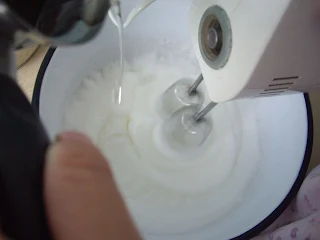 In alt vas se bate frisca.Cu o lingura metalica incorporam usor in spuma de albusuri cu zahar.