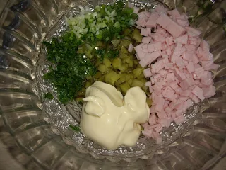 Le scoatem pe un servetel din hartie pentru a se absoarbe tot uleiul.Taiem sunca si castravetii murati cubulete,ceapa rondele si patrunjelul tocat marunt.Amestecam cu maioneza light si potrivim de sare si piper.