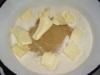 Faina o amestecam cu zaharul si esenta intr-un castron.Margarina sau untul il taiem cuburi si il adaugam impreuna cu faina.