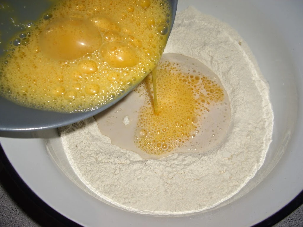 Faina,drojdia,zaharul,laptele,ouale si 1/2 lingurita sare le amestecam 10 minute.