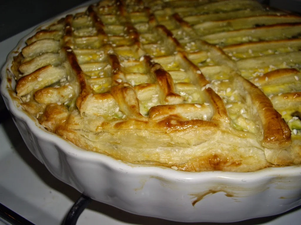 Ungem cu ulei o forma rotunda sau patrata din ceramica intindem aluatul pe toata suprafata apoi turnam compozitia de legume.Taiem in fasii subtiri aluatul ramas si asezam grilaje deasupra tartei.Ungem fisiile de aluat cu galbenusul pe care l-am amestecat cu putin lapte.Presaram seminte de susan apoi o dam la cuptor la foc mediu pentru 35-40 minute.